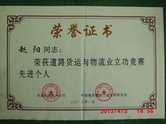 2013年4月2日,公司董事長趙陽在“道路貨運(yùn)與物流業(yè)立功競賽”活動中,被交通運(yùn)輸部辦公廳和中國海員建設(shè)工會全國委員會聯(lián)合授予“先進(jìn)個人”榮譽(yù)稱號。