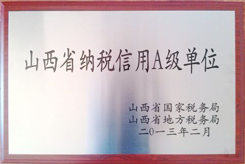 2014年元月15日,我公司榮獲省國稅、省地稅聯(lián)合頒發(fā)的“山西省納稅信用A級單位”榮譽(yù)稱號。